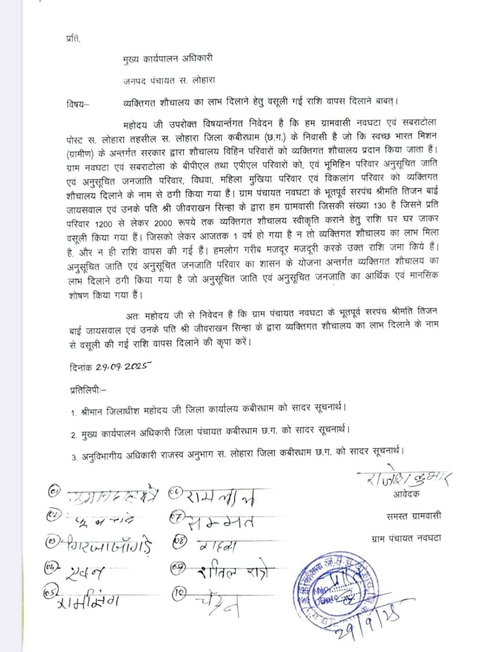 सहसपुर लोहारा। राष्ट्रीय स्तर की स्वच्छ भारत मिशन (ग्रामीण) योजना के अंतर्गत बड़ा खुलासा हुआ है, जहां जनपद पंचायत सहसपुर लोहारा अंतर्गत ग्राम नवघटा और सबराटोला के 137 गरीब ग्रामीणों से व्यक्तिगत शौचालय स्वीकृति दिलाने के नाम पर भारी-भरकम वसूली का आरोप सामने आया है। ग्रामीणों के मुताबिक, ग्राम पंचायत नवघटा की भूतपूर्व सरपंच तिजन बाई जायसवाल और उनके पति जीवराखन सिन्हा ने प्रति परिवार 1000 से 2000 रुपये तक की वसूली घर–घर जाकर की।